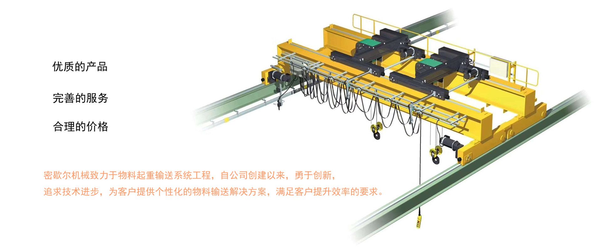 密歇爾起重機械(杭州)有限公司,作為專業的電動葫蘆和起重機及物料起重輸送系統設計、制造和銷售綜合服務商,自公司創建以來,勇于創新,追求技術進步,并依托我們的技術研發中心,現已成為國內起重機械行業的新興優秀企業。